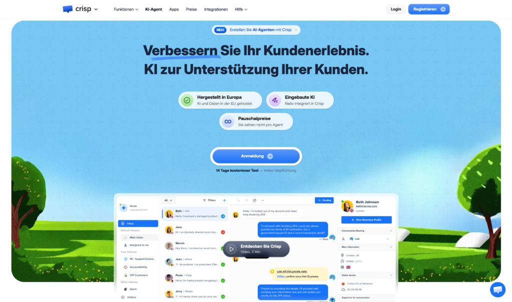 Crisp gehört zu den führenden Plattformen im Bereich KI-gestützter Kundensupport und kombiniert eine besonders einfache Bedienung mit leistungsstarken KI-Funktionen.